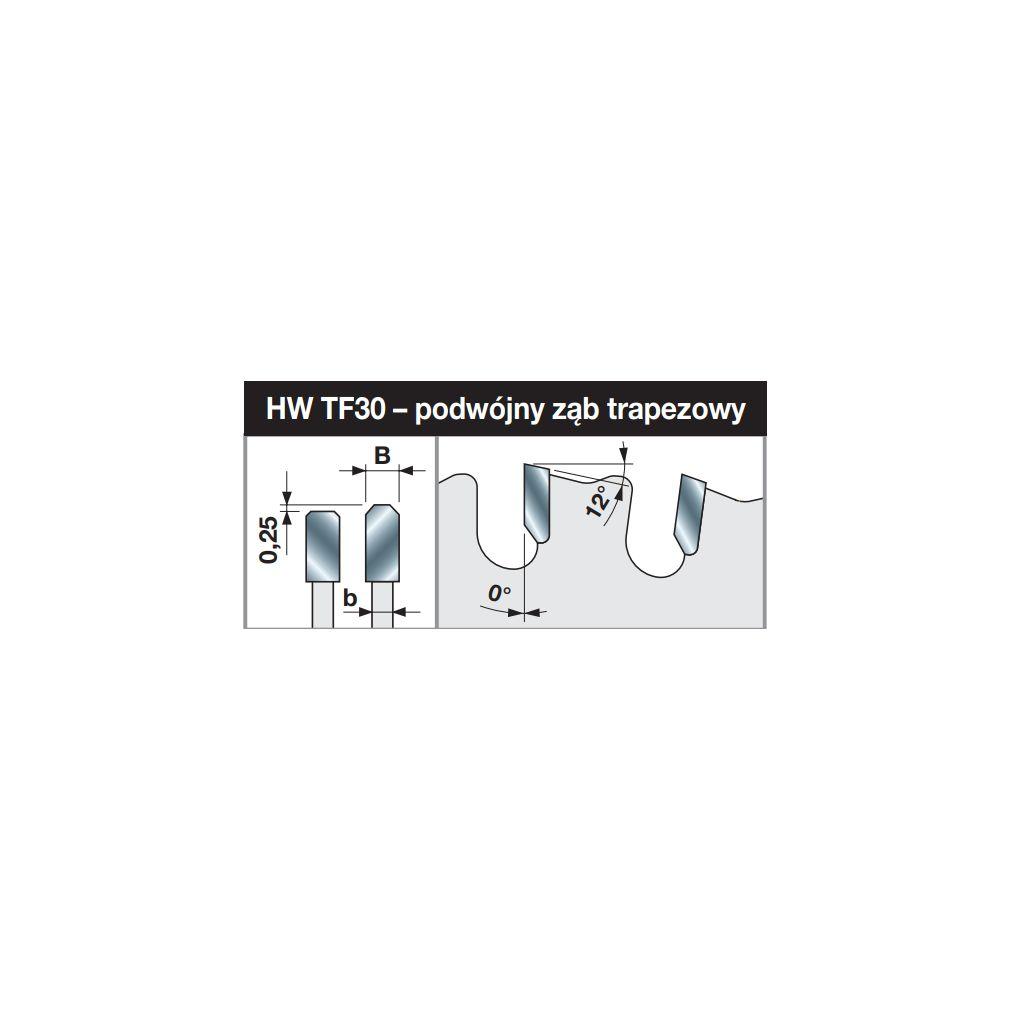 | Średnica piły | Szerokość rzazu piły | Szerokość płaszcza piły | Średnica otworu mocującego | Liczba zębów piły | Kąt natarcia | Nr katalogowy |
